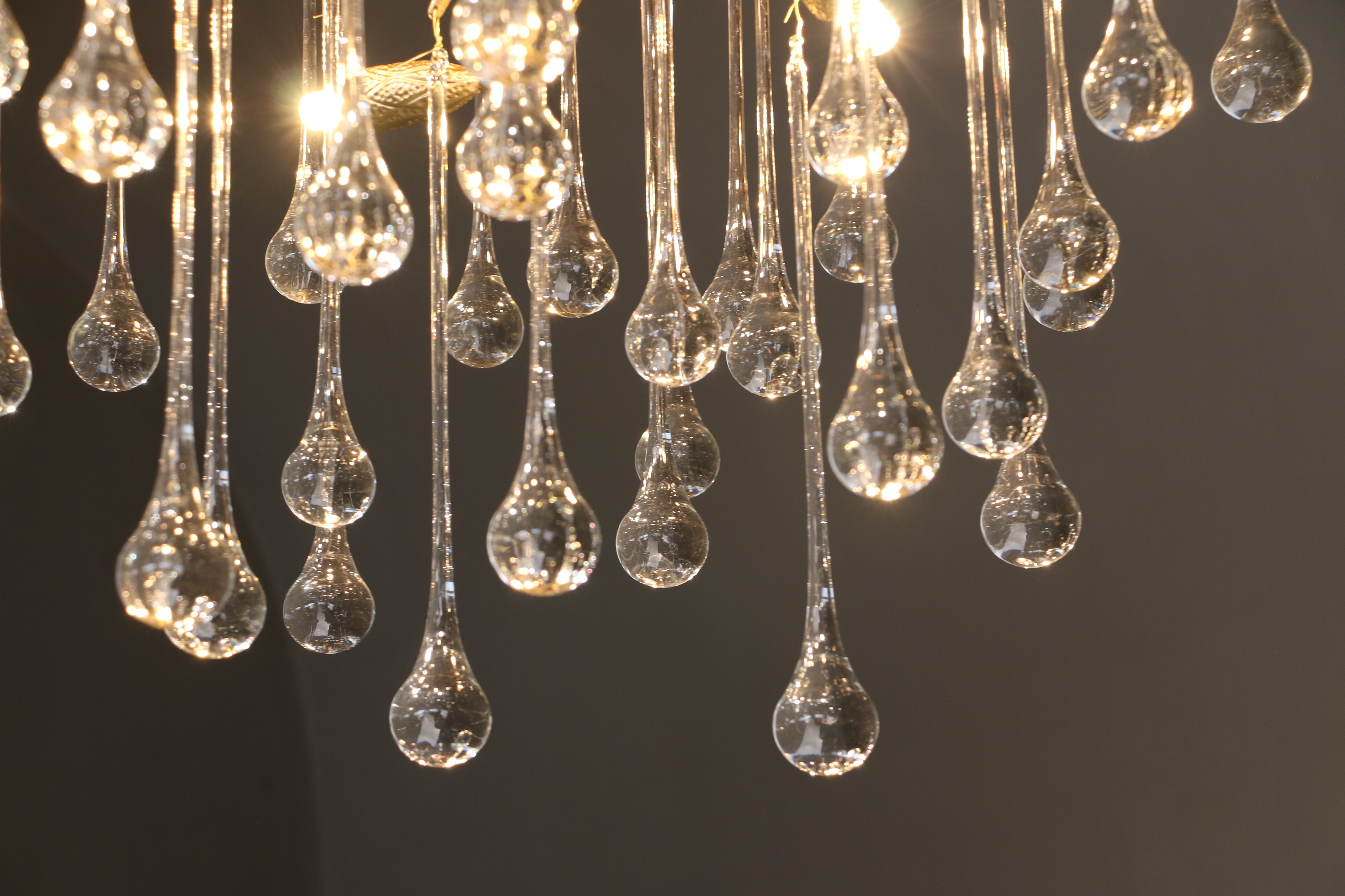 แท่งแก้วรูปทรงหยดน้ำมีงานฝีมือที่ประณีตและส่งผ่านแสงอย่างสม่ำเสมอ นุ่มนวล และไม่มีแสงจ้า